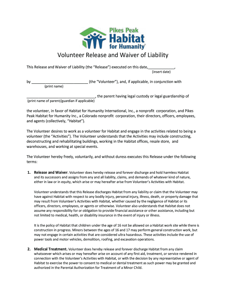 Volunteer Release and Waiver of Liability This Release and Waiver of Liability (the Release) executed on this date, (insert date) by (the Volunteer×, and, if applicable, in conjunction with (print