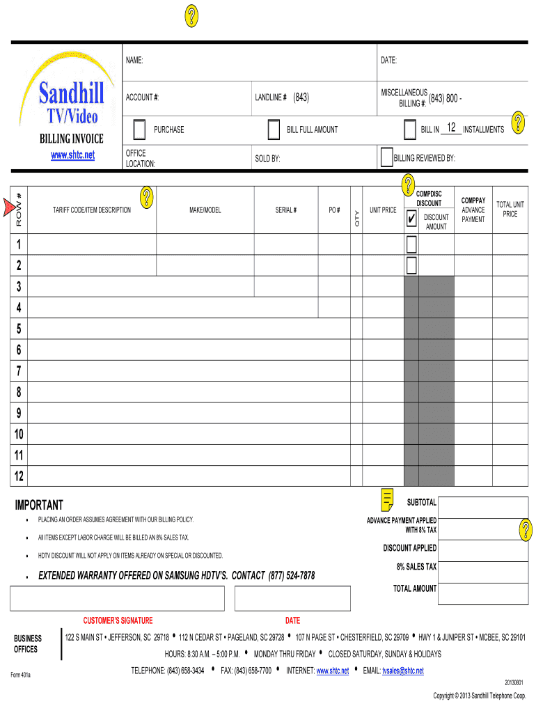 NAME: DATE: ACCOUNT #: PURCHASE D ROW # MISCELLANEOUS BILLING #: (843) (843) OFFICE LOCATION: BILLING REVIEWED BY: SOLD BY: TARIFF CODE×ITEM DESCRIPTION MAKE×MODEL 800 12 Bills IN INSTALLMENTS BILL