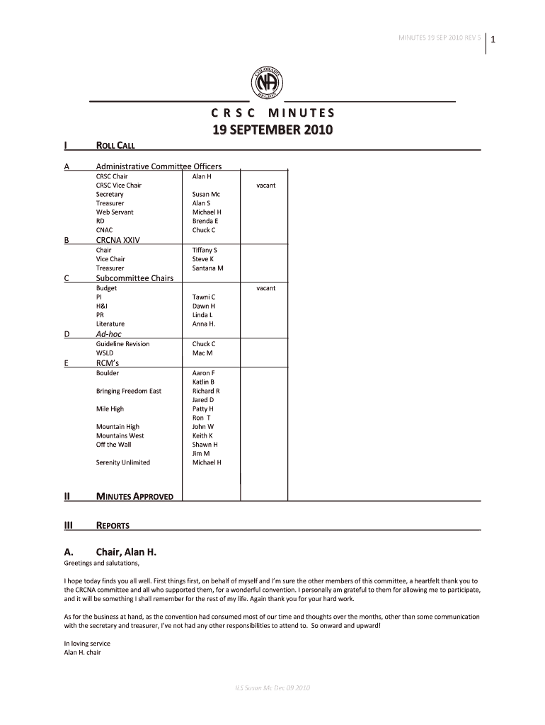 MINUTES 19 SEP 2010 REV 5 C R S C MINUTES 19 SEPTEMBER 2010 I ROLL CALL A Administrative Committee Officers CRC Chair CRC Vice Chair Secretary Treasurer Web Servant RD CNAC B vacant Tawny C Dawn H