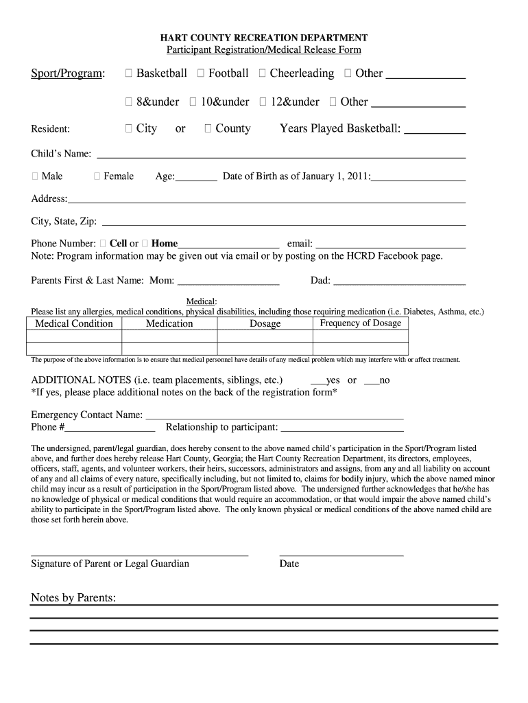 Get the free HART COUNTY RECREATION DEPARTMENT Participant Registration/Medical Release Form Spor...