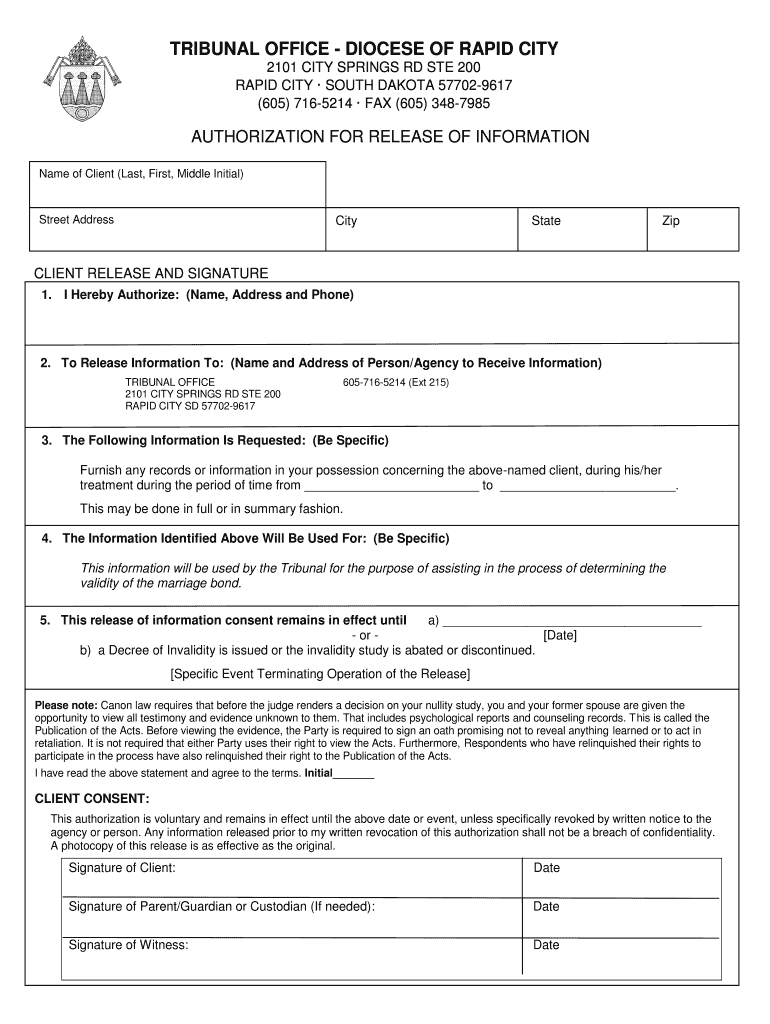TRIBUNAL OFFICE DIOCESE OF RAPID CITY 2101 CITY SPRINGS RD STE 200 RAPID CITY SOUTH DAKOTA 577029617 605 7165214 FAX (605 3487985 AUTHORIZATION FOR RELEASE OF INFORMATION Name of Client (Last, First,