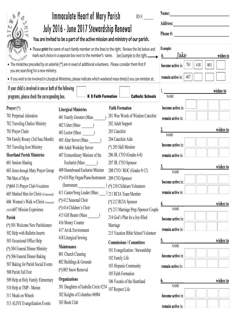 Immaculate Heart of Mary Parish July 2016 June 2017 Stewardship Renewal ID #: Name: Address: Phone #: You are invited to be a part of the active mission and ministry of our parish. Please print the