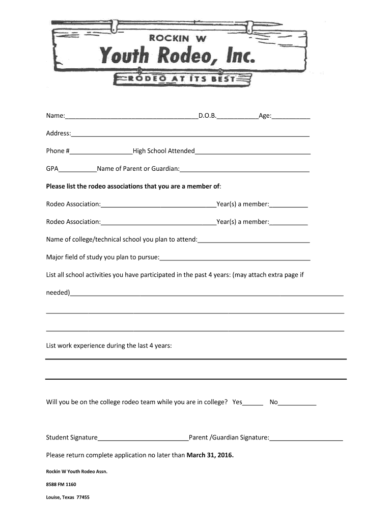 Name: D.O.B. Age: Address: Phone # High School Attended GPA Name of Parent or Guardian: Please list the rodeo associations that you are a member of: Rodeo Association: Year’s) a member: Rodeo Association: