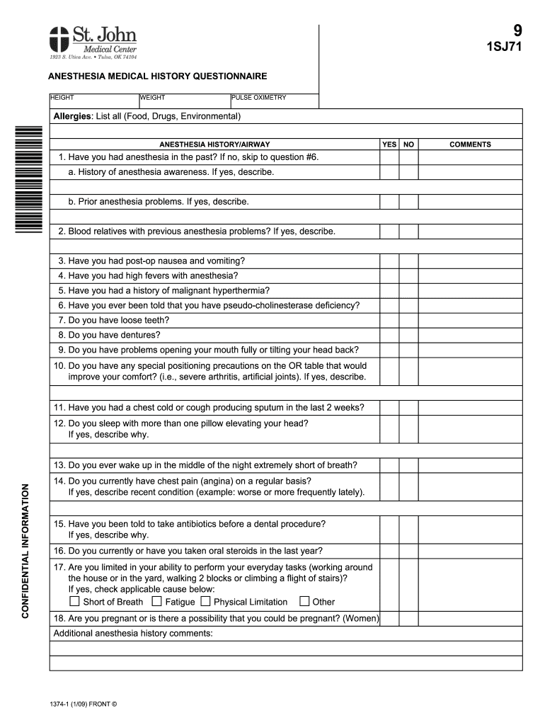 9 1SJ71 ANESTHESIA MEDICAL HISTORY QUESTIONNAIRE HEIGHT WEIGHT PULSE OXIMETRY Allergies: List all (Food, Drugs, Environmental) ANESTHESIA HISTORY×AIRWAY 1. Have you had anesthesia in the past? If