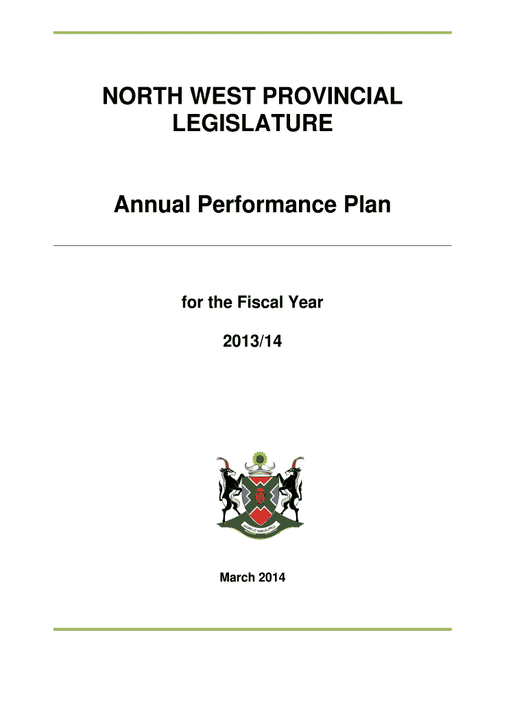 NORTH WEST PROVINCIAL LEGISLATURE Annual Performance Plan for the Fiscal Year 2013×14 March 2014 FOREWORD PRESENTED BY THE HONORABLE SPEAKER OF THE NORTH WEST PROVINCIAL LEGISLATURE HON. S.O.R. MAHUMAPELO