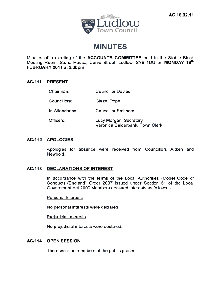 AC 16.02.11 MINUTES of a meeting of the ACCOUNTS COMMITTEE held in the Stable Block Meeting Room, Stone House, Core Street, Ludo, SY8 1DG on MONDAY 16th FEBRUARY 2011 at 2.00pm AC×111 PRESENT Chairman: