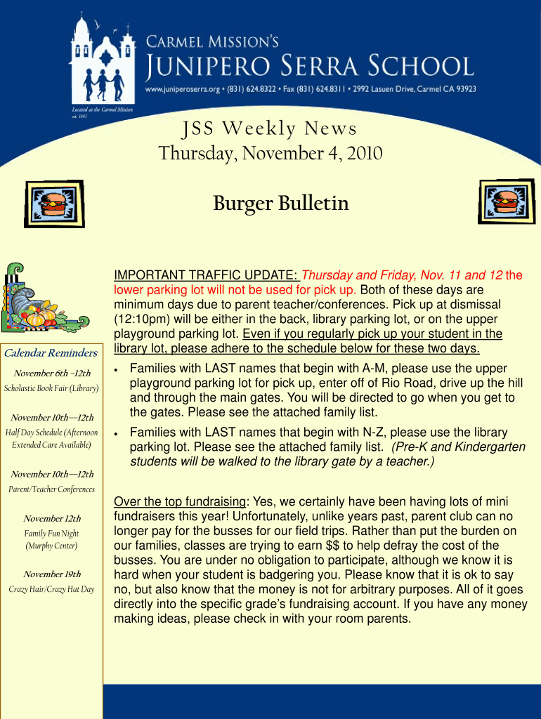 CSS Weekly News Thursday, November 4, 2010, Burger Bulletin Calendar Reminders November 6th 12th IMPORTANT TRAFFIC UPDATE: Thursday and Friday, Nov. 11 and 12 the lower parking lot will not be used