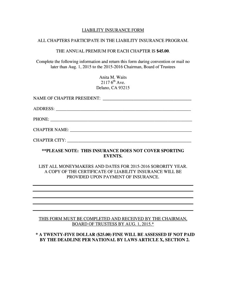 LIABILITY INSURANCE FORM ALL CHAPTERS PARTICIPATE IN THE LIABILITY INSURANCE PROGRAM. THE ANNUAL PREMIUM FOR EACH CHAPTER IS $45.00. Complete the following information and return this form during