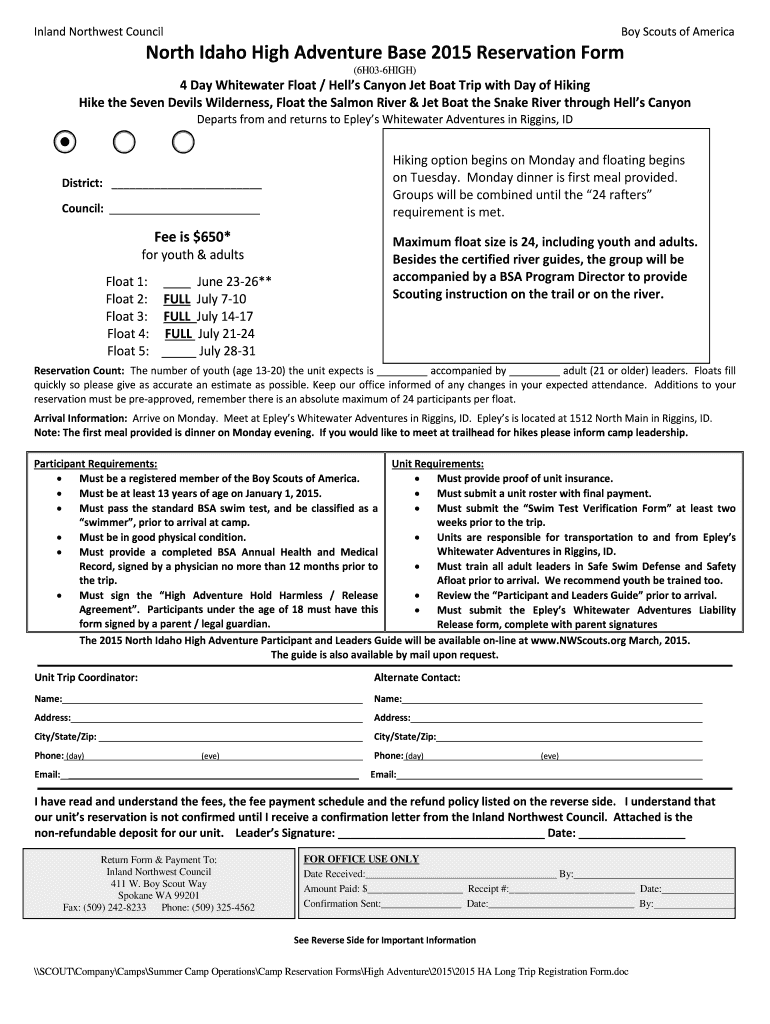 Inland Northwest Council Boy Scouts of America North Idaho High Adventure Base 2015 Reservation Form (6H036HIGH) 4 Day Whitewater Float / Hell's Canyon Jet Boat Trip with Day of Hiking Hike the Seven