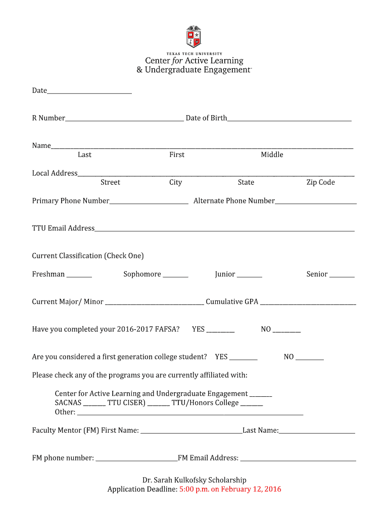 Dr. Sarah Kulkofsky Scholarship 20162017 Purpose: The Dr. Sarah Kulkofsky Scholarship will provide scholarship support to at least one undergraduate researcher at Texas Tech University. An undergraduate