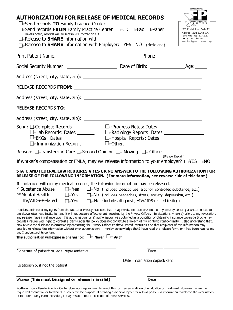 AUTHORIZATION FOR RELEASE OF MEDICAL RECORDS Send records TO Family Practice Center Send records FROM Family Practice Center CD Unless noted, records will be sent in PDF format on CD. Fax Paper Release