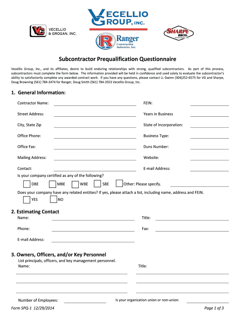 General contractors or companies looking to hire subcontractors are required to have the subcontractors complete and file a prequalification questionnaire.