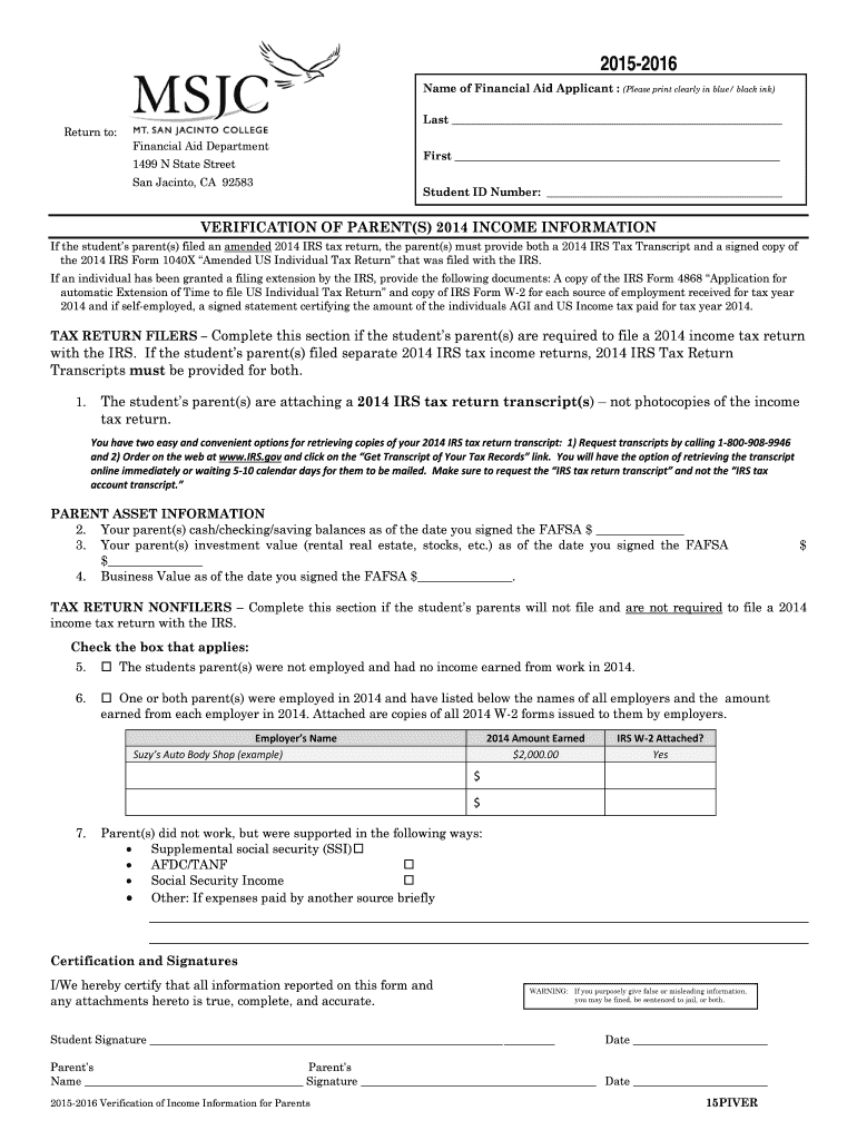 20152016 Names of Financial Aid Applicant : (Please print clearly in blue/ black ink) Return to: Last Financial Aid Department 1499 N State Street San Jacinto, CA 92583 First Student ID Number: VERIFICATION