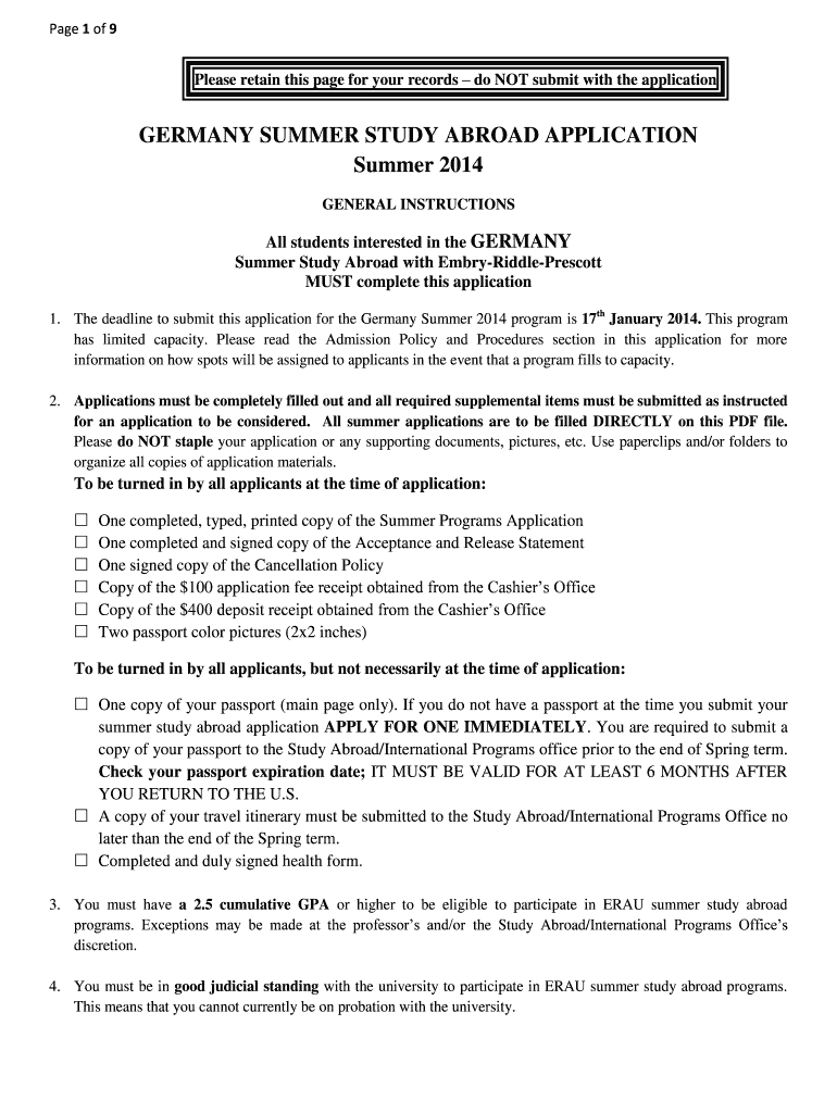 Page 1 of 9 Please retain this page for your records do NOT submit with the application GERMANY SUMMER STUDY ABROAD APPLICATION Summer 2014 GENERAL INSTRUCTIONS All students interested in the GERMANY
