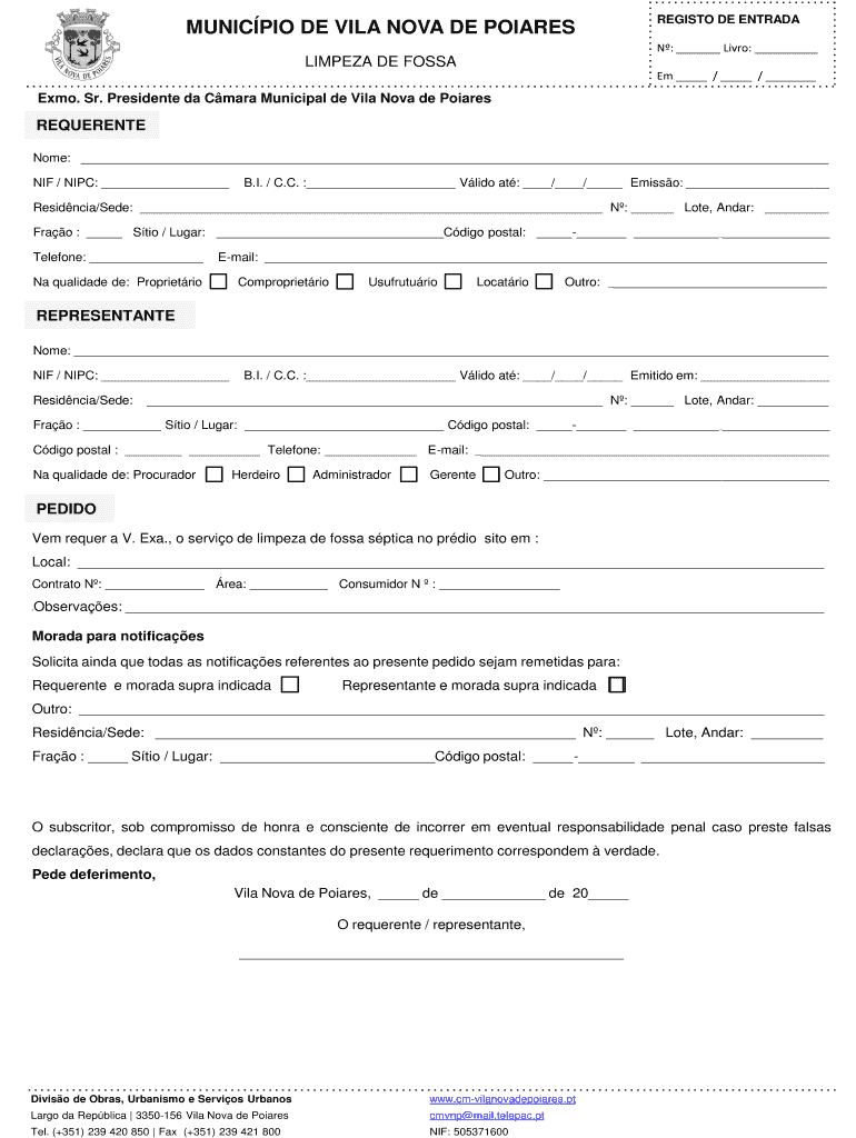 REGISTER DE ESTRADA MUNICIPAL DE VILA NOVA DE PORES N: Live: LIMPED DE FOSSA Em / / Elmo. Sr. President the Clara Municipal de Vila Nova de Poiares REFERENCE Nome: NIF / NPC: B.I. C.C. : Lido at: