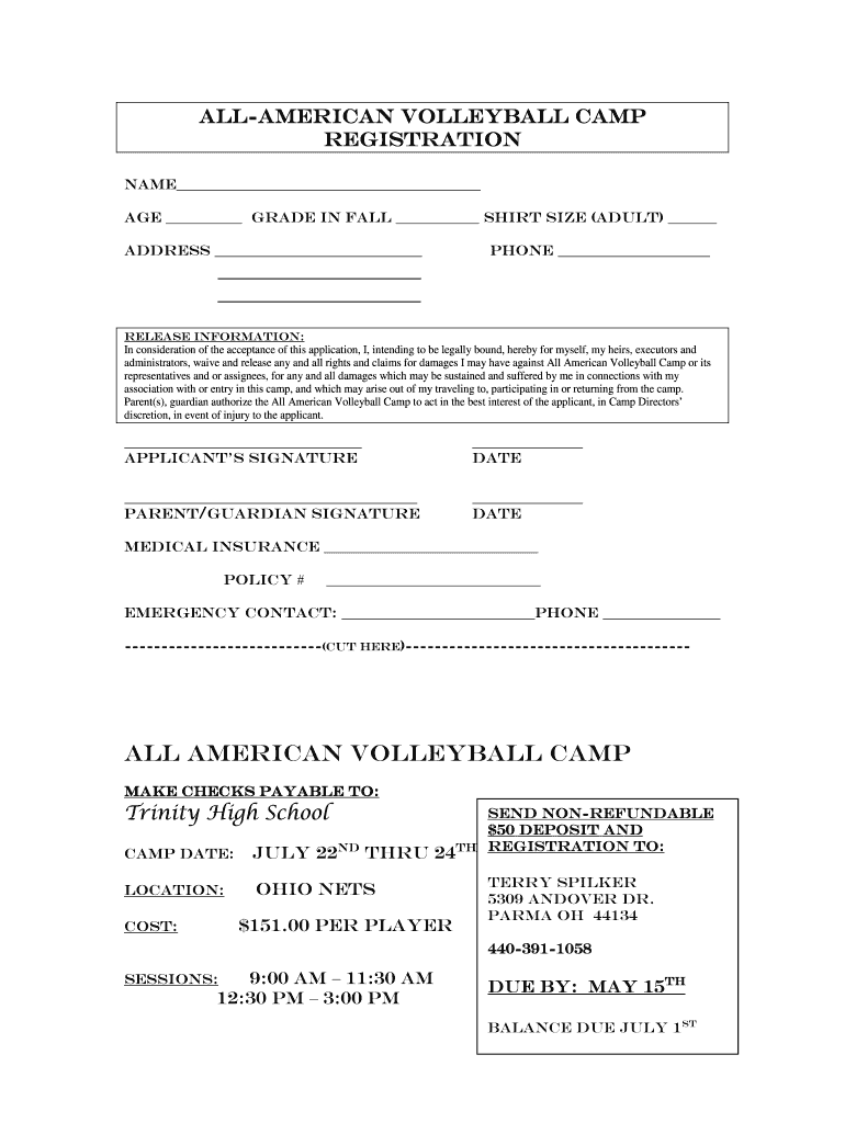 AllAllAmerican volleyball camp registration Name Age grade in fall shirt size (adult) Address phone release information: In consideration of the acceptance of this application, I, intending to be