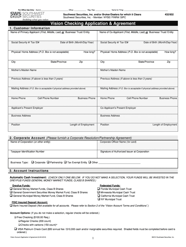 For Office Use Only: Acct.# Office: Reg. Rep: Name for Filing: Southwest Securities, Inc. and or Broker Dealers for which it Clears Southwest Securities, Inc. Member: NYSE/ FINRA/ SIPC 432 932 Vision