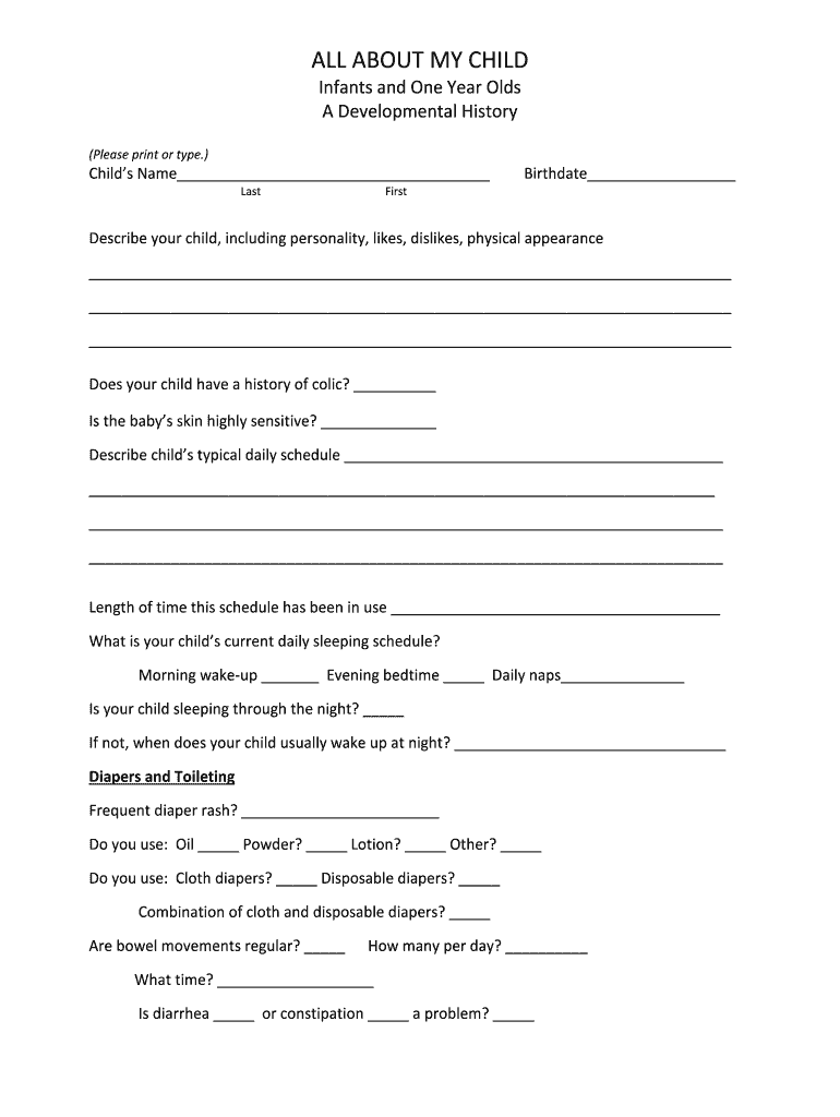 ALL ABOUT MY CHILD Infants and One-Year-Olds A Developmental History (Please print or type.) Child's Name Last Birthdate First Describe your child, including personality, likes, dislikes, physical