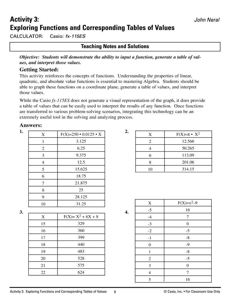 Activity 3: Exploring Functions and Corresponding Tables of Values CALCULATOR: John Nepal Casio: fx115ES Teaching Notes and Solutions Objective: Students will demonstrate the ability to input a function,
