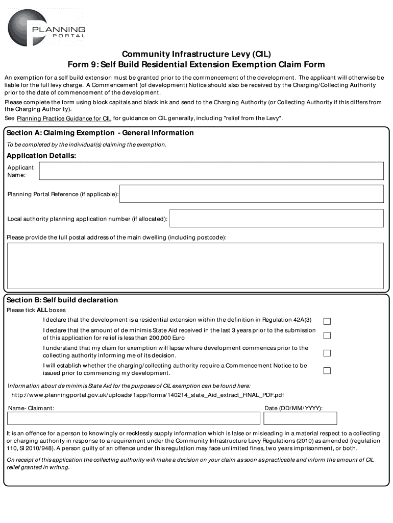 Form 9: Self Build Residential Extension Exemption Claim Form