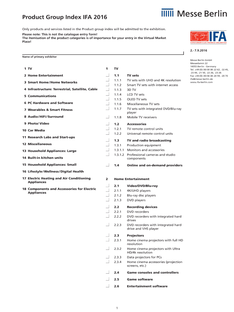 Product Group Index IFA 2016 Only products and services listed in the Product group index will be admitted to the exhibition. Please note: This is not the catalog entry form! The itemization of the