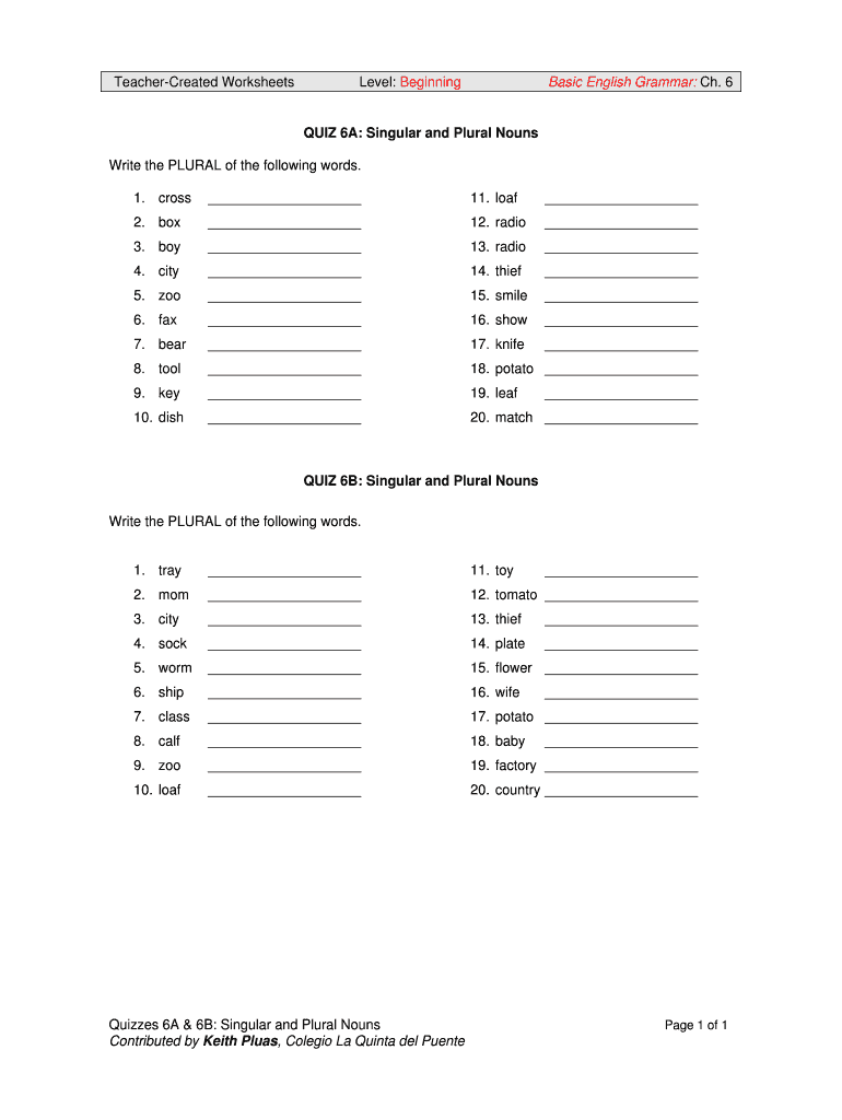 TeacherCreated Worksheets Level: Beginning Basic English Grammar: Ch. 6 QUIZ 6A: Singular and Plural Nouns Write the PLURAL of the following words. 1. cross 11. Loaf 2. Box 12. Radio 3. Boy 13. Radio