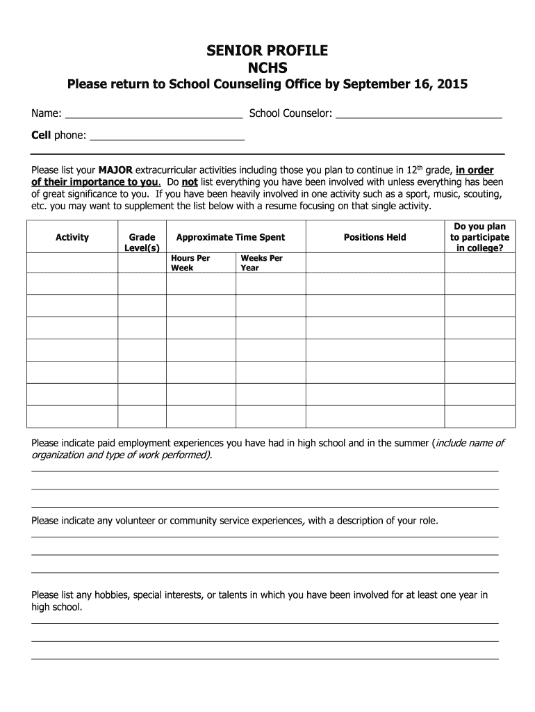 SENIOR PROFILE NHS Please return to School Counseling Office by September 16, 2015, Name: School Counselor: Cell phone: Please list your MAJOR extracurricular activities including those you plan to