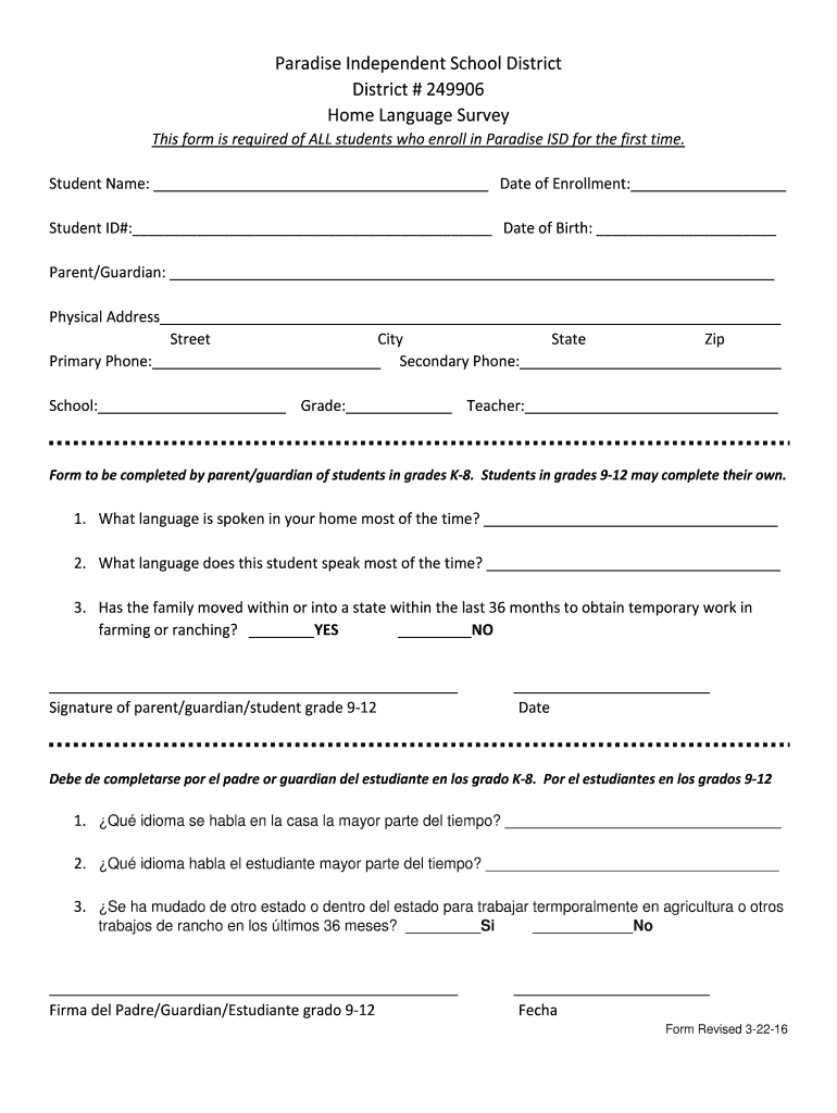 Paradise Independent School District # 249906 Home Language Survey This form is required of ALL students who enroll in Paradise ISD for the first time. Student Name: Date of Enrollment: Student ID#: