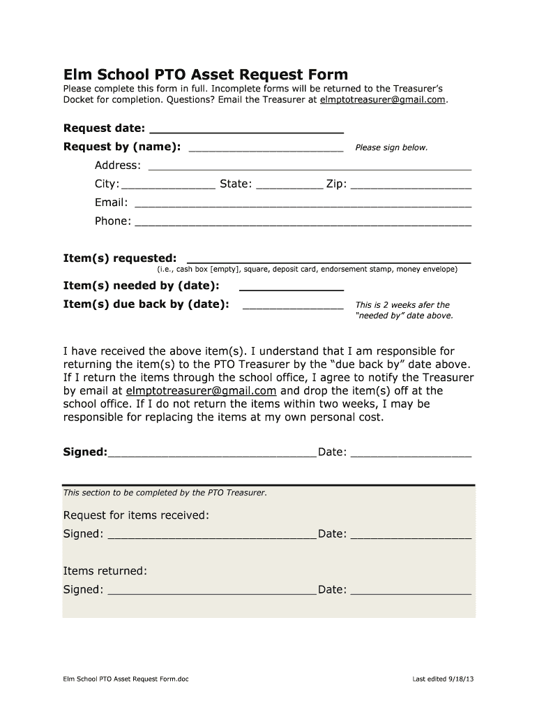 Elm School PTO Asset Request Form Please complete this form in full. Incomplete forms will be returned to the Treasurers Docket for completion. Questions? Email the Treasurer at elmptotreasurer gmail.com.