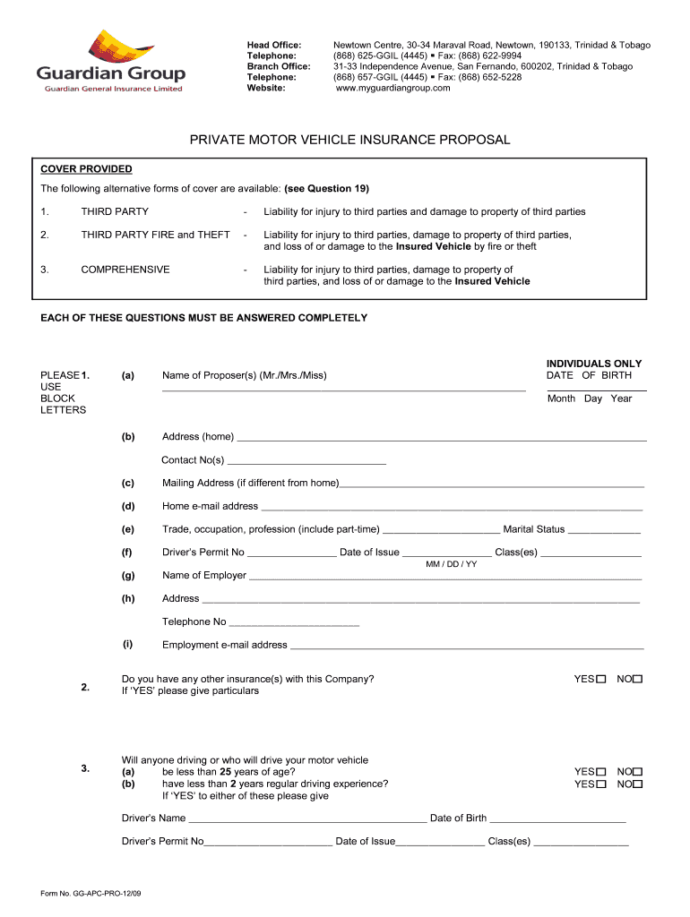 Get the free Private Motor Vehicle Insurance Proposal - Guardian Group