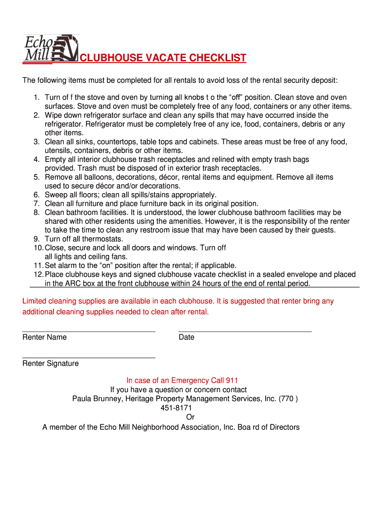 Get the free CLUBHOUSE VACATE CHECKLIST - Echo Mill - echomill
