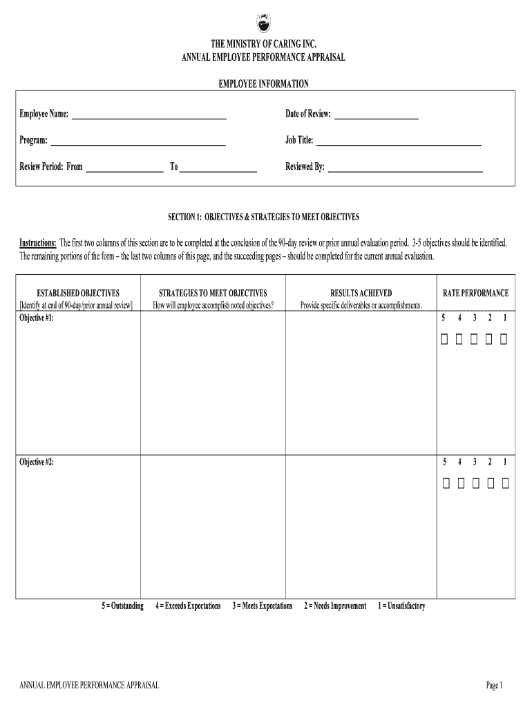 THE MINISTRY OF CARING INC. ANNUAL EMPLOYEE PERFORMANCE APPRAISAL EMPLOYEE INFORMATION Employee Name: Date of Review: Program: Job Title: Review Period: From Reviewed By: To SECTION 1: OBJECTIVES