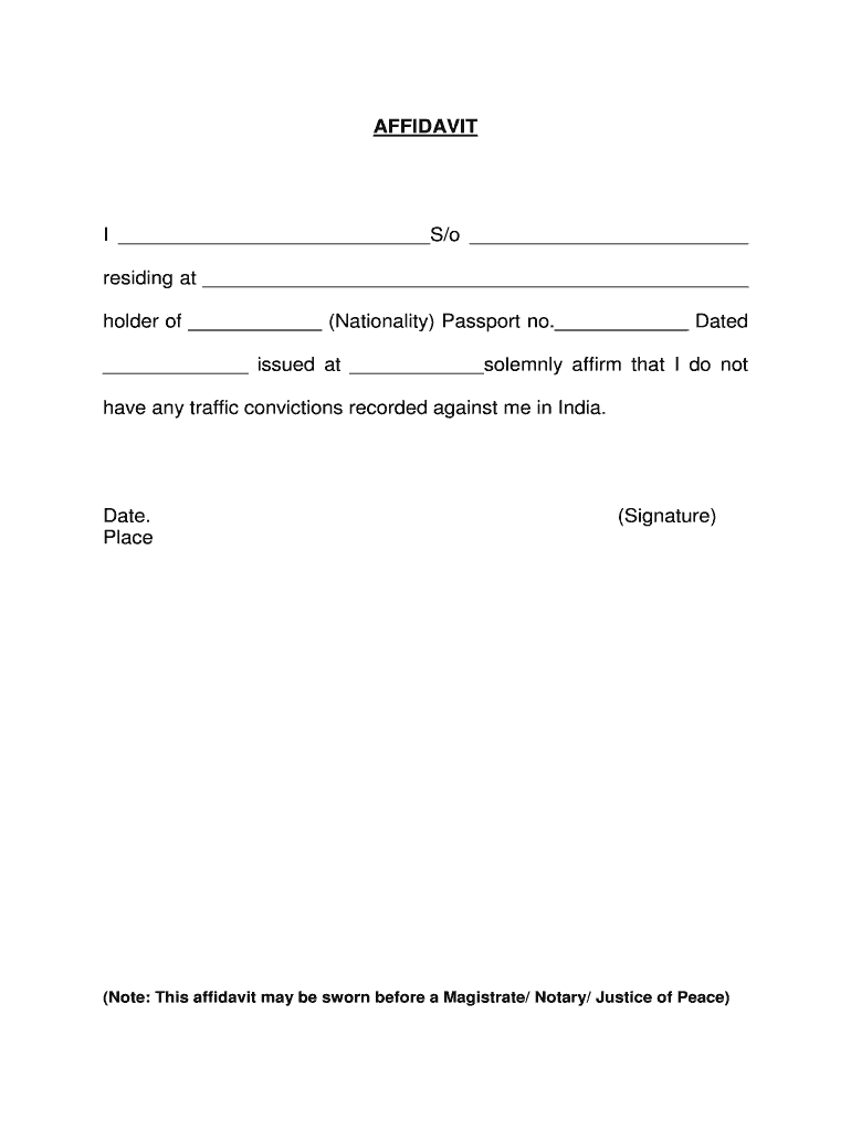 AFFIDAVIT I S×o residing at holder of (Nationality) Passport no. Dated issued at solemnly affirm that I do not have any traffic convictions recorded against me in India. Date. Place (Signature) (Note: