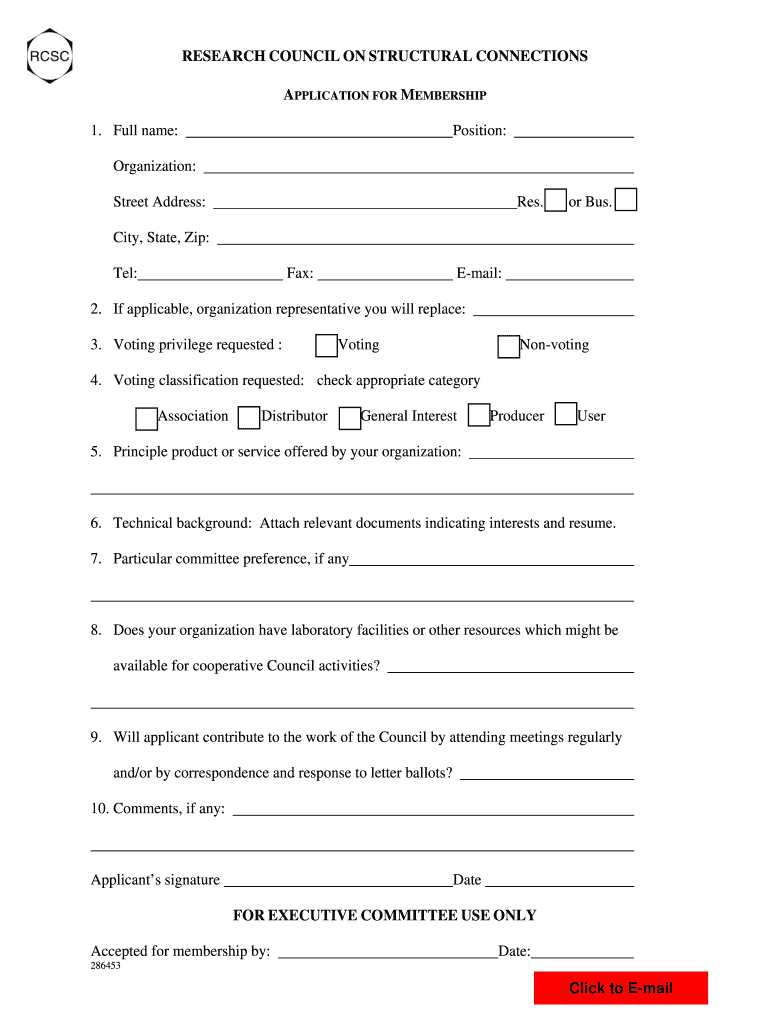 RESEARCH COUNCIL ON STRUCTURAL CONNECTIONS APPLICATION FOR MEMBERSHIP Position: 1. Full name: Organization: Res. () or Bus. () Street Address: City, State, Zip: Tel: Fax: Email: 2. If applicable,