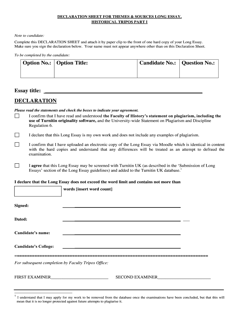 DECLARATION SHEET FOR THEMES & SOURCES LONG ESSAY, HISTORICAL TRIPOS PART I Note to candidate: Complete this DECLARATION SHEET and attach it by paper clip to the front of one hard copy of your Long