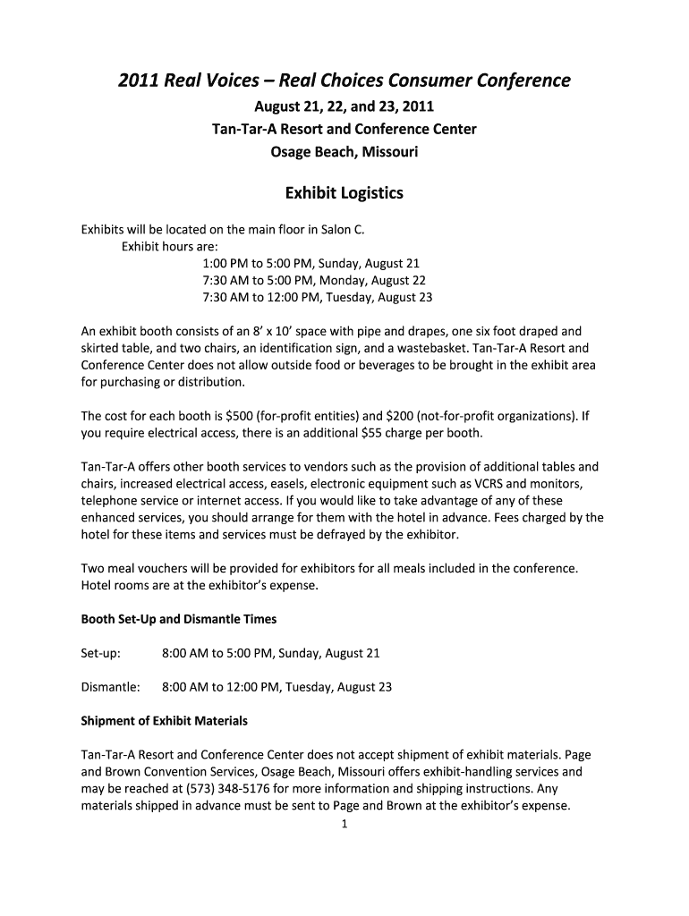 2011 Real Voices Real Choices Consumer Conference August 21, 22, and 23, 2011 Tantra Resort and Conference Center Osage Beach, Missouri Exhibit Logistics Exhibits will be located on the main floor