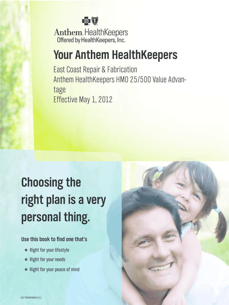 Your Anthem Healthineers East Coast Repair & Fabrication Anthem Healthineers HMO 25 500 Value Advantage Effective May 1, 2012, Choosing the right plan is a very personal thing. Use this book to find