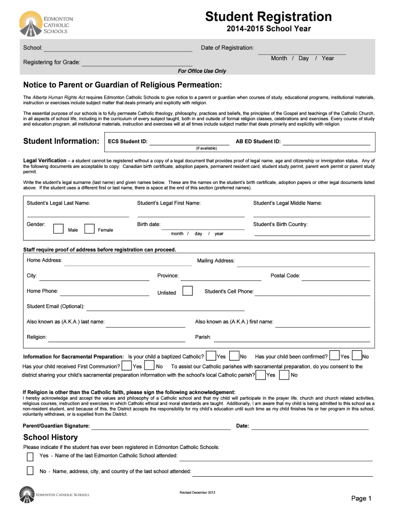 Student Registration 20142015 School Year School: Date of Registration: Month / Day Registering for Grade: / Year For Office Use Only Notice to Parent or Guardian of Religious Permeation: The Alberta