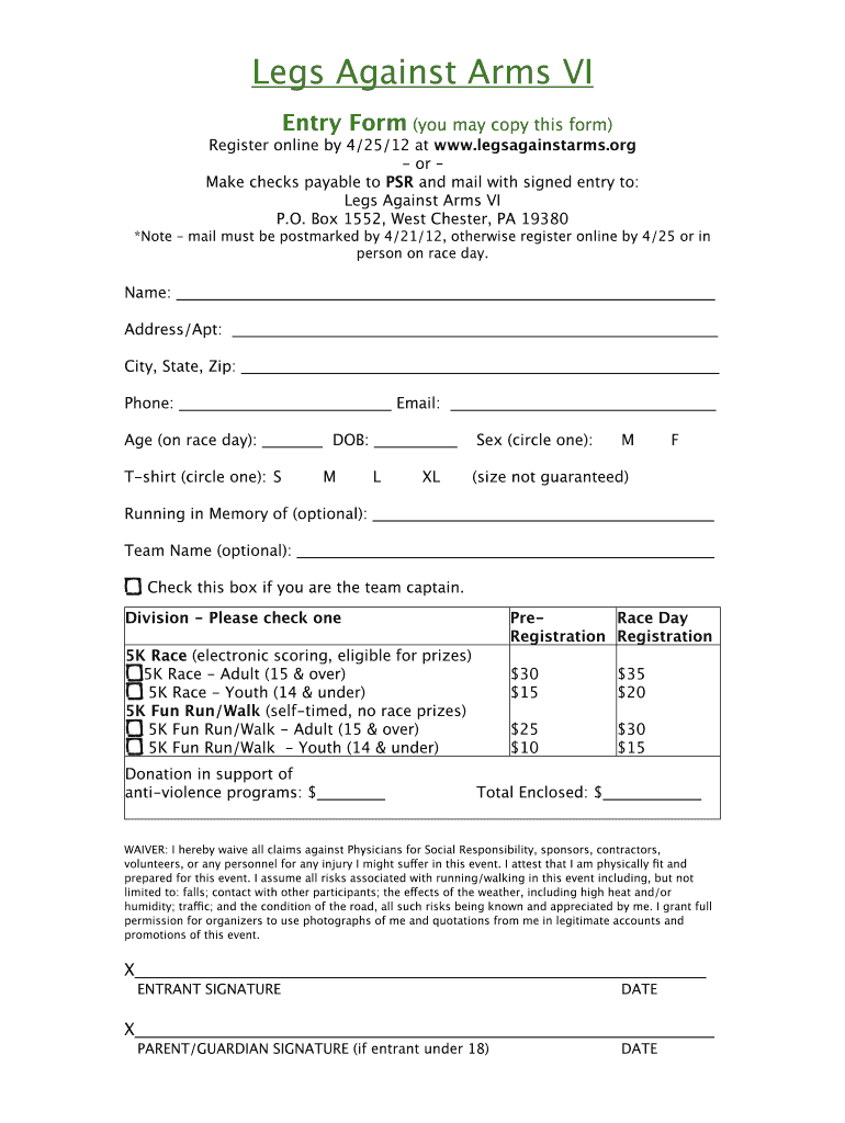 Get the free Legs Against Arms VI Entry Form