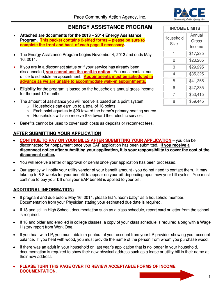 Pace Community Action Agency, Inc. ENERGY ASSISTANCE PROGRAM Attached are documents for the 2013 2014 Energy Assistance Program. This packet contains 2sided forms please be sure to complete the front