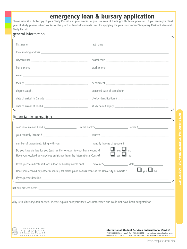 Emergency loan & bursary application Please submit a photocopy of your Study Permit, and photocopies of your sources of funding with this application. If you are in your first year of study, please