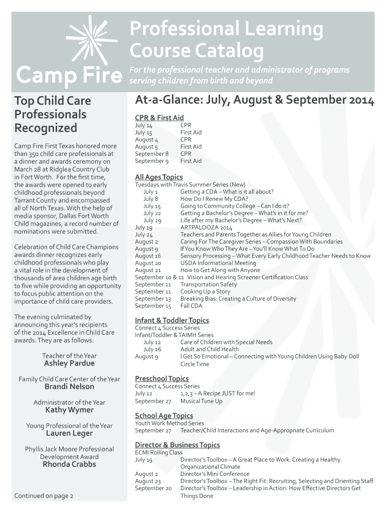 Professional Learning Course Catalog For the professional teacher and administrator of programs serving children from birth and beyond Top Child Care Professionals Recognized Camp Fire First Texas