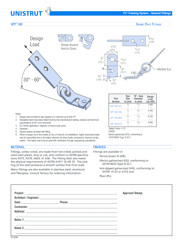 158 Framing System General Fittings SPF 300 Seismic Pivot Fittings Design Load 134 (45) Rotate Around Rod to Close 134 (45 2 (51 13 16 (21 R 30 60 9 16 (14 2 (51 3 8 (10 3 8 (10) Rod R Hole Size Diameter