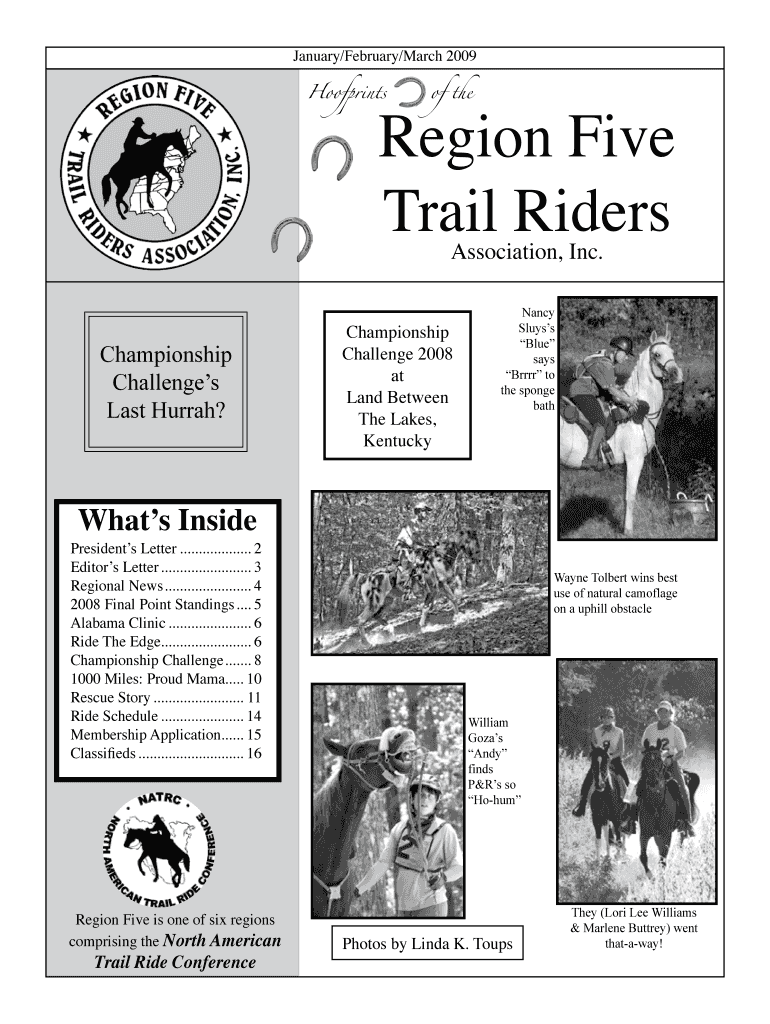 January×February×March 2009 Hoof prints of the Region Five Trail Riders Association, Inc. Championship Challenges Last Hurrah? Championship Challenge 2008 at Land Between The Lakes, Kentucky Nancy
