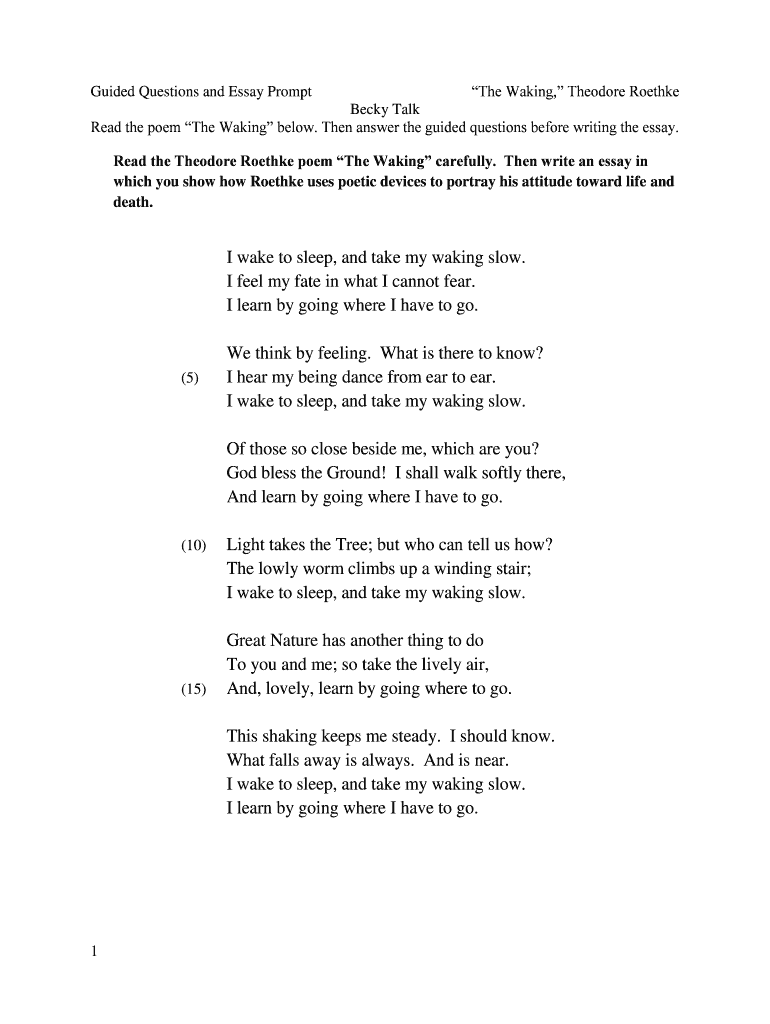 Guided Questions and Essay Prompt The Waking, Theodore Retake Becky Talk Read the poem The Waking below. Then answer the guided questions before writing the essay. Read the Theodore Retake poem The