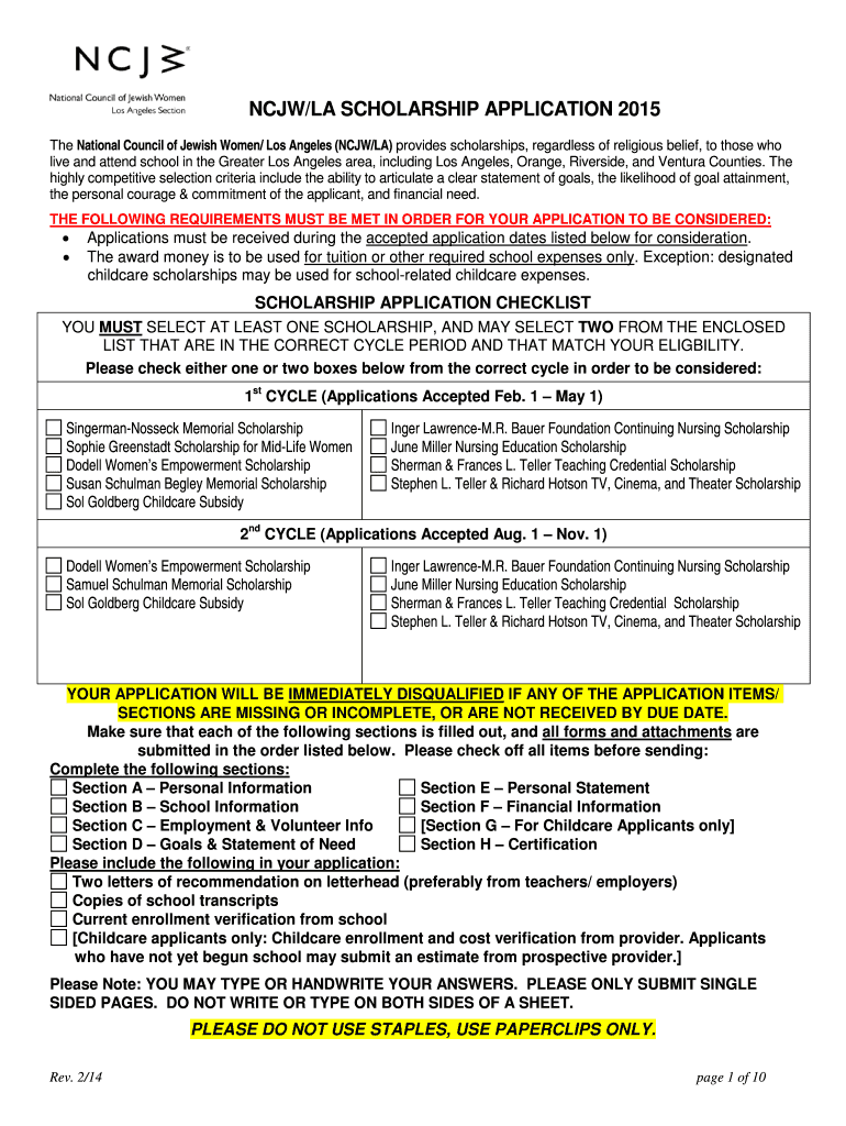 NCW LA SCHOLARSHIP APPLICATION 2015 The National Council of Jewish Women/ Los Angeles (NCW LA) provides scholarships, regardless of religious belief, to those who live and attend school in the Greater