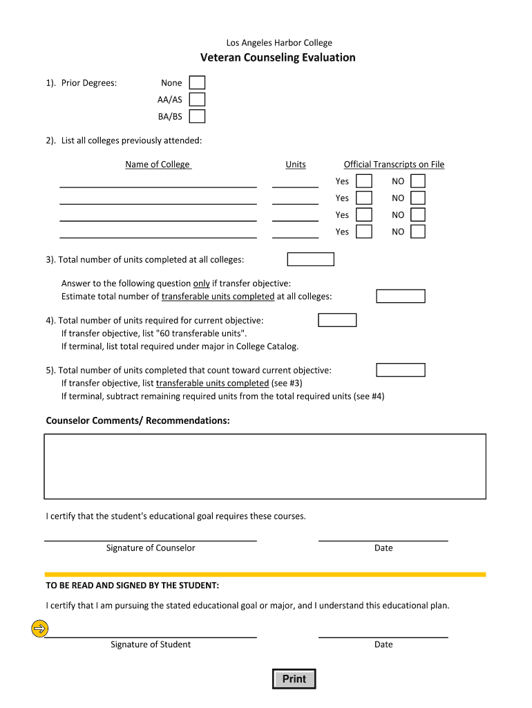 Los Angeles Harbor College Veteran Counseling Evaluation 1. Prior Degrees: None AA AS BA BS 2. List all colleges previously attended: Name of College Units Official Transcripts on File Yes NO 3. Total