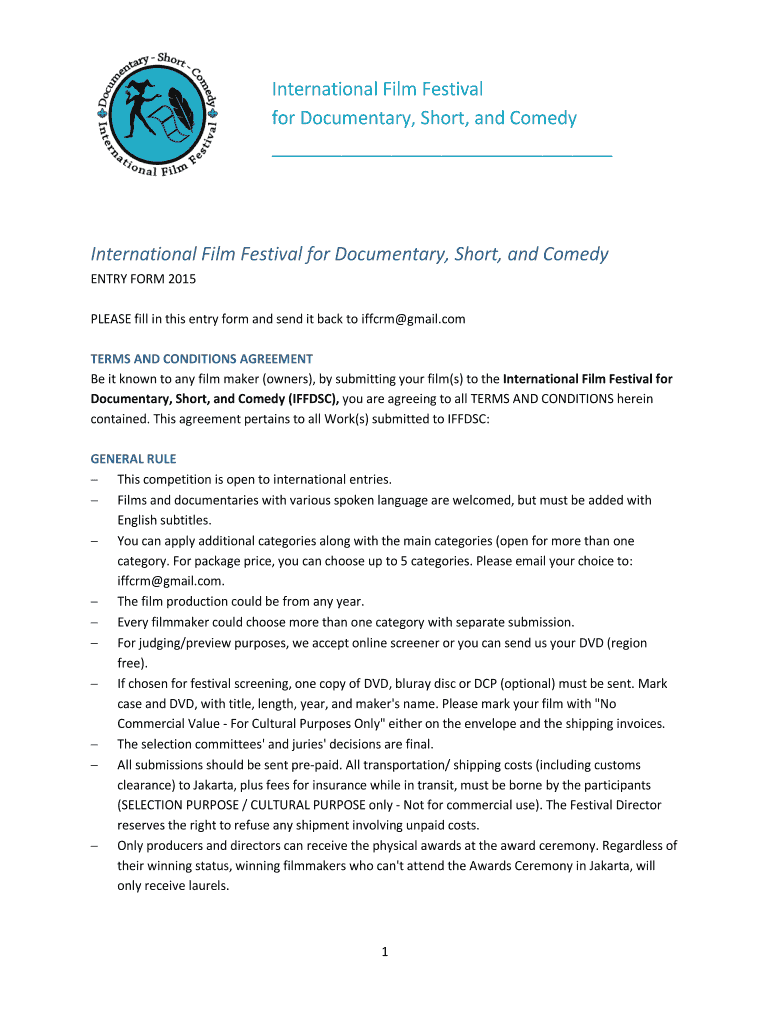 International Film Festival for Documentary, Short, and Comedy International Film Festival for Documentary, Short, and Comedy ENTRY FORM 2015 PLEASE fill in this entry form and send it back to inform
