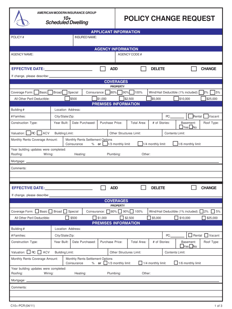 This document is a request form for policy changes related to insurance coverage for properties, gathering detailed applicant, agency, and underwriting information.