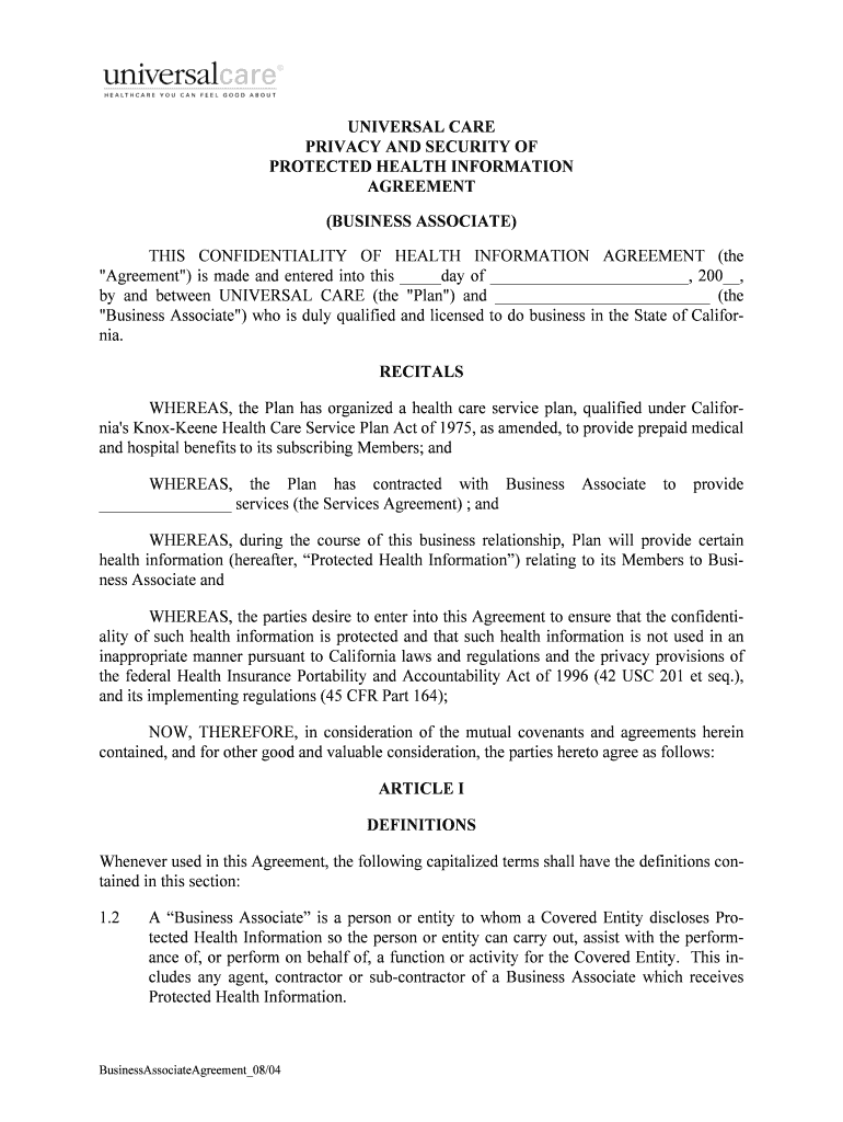 The HIPAA Business Associate Agreement is a legal document used by healthcare organizations to ensure the confidentiality of protected health information (PHI) between a healthcare service plan and a business associate.